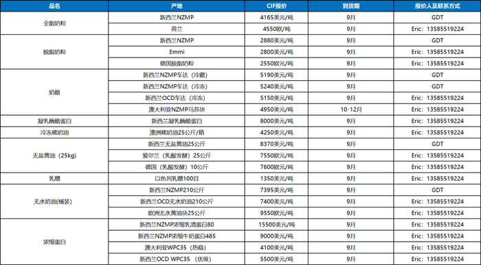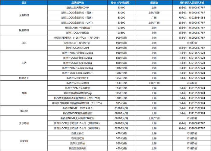 车达马苏:车达各类产品供应有序,需求平稳;进口马苏碎全线供应紧缺,但由于本产季美国同类产品到货大量减少,市场不得不用进口马苏块自切替代,马苏块迎来最近5年难得的行情;国产原制奶酪碎的替代也开始逐渐起步,国内龙头生产企业开始进攻该市场;再制马苏碎继续厮杀激烈,不过得益于国内低价马苏Curd的大规模使用,整体生产成本有所降低,还是维持了一定的利润空间 。