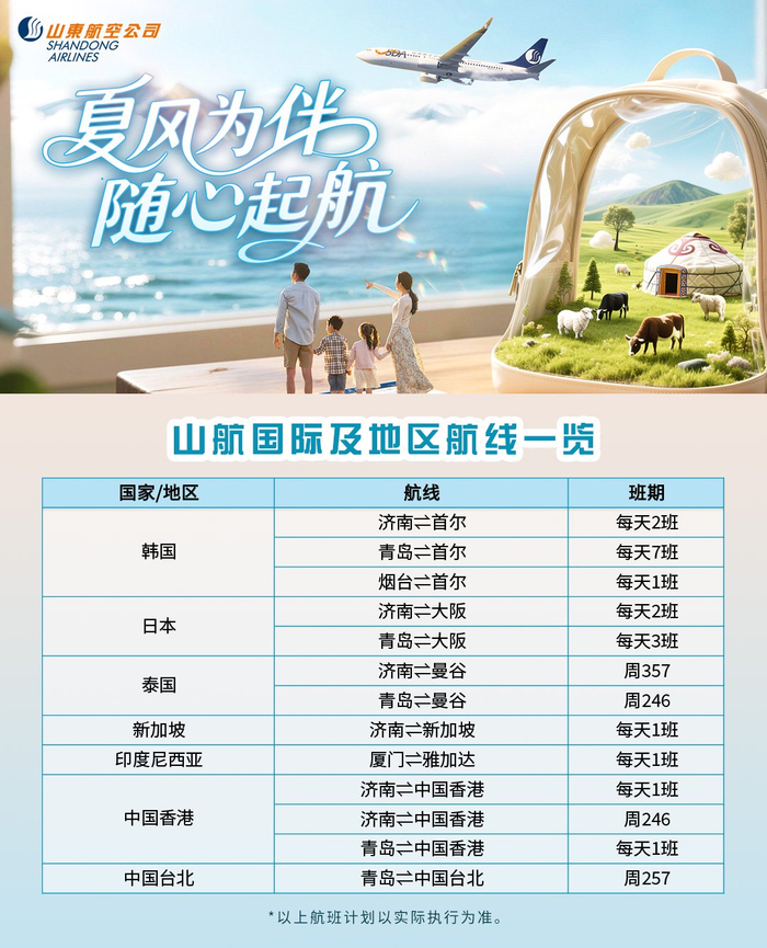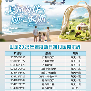 今年暑期,山航全新推出研学游、校园飞人、有礼经济舱、经鲁飞等产品,并优化预付费行李、预购升舱、预约选座等个性化服务。国际及地区航线方面,推出多人同行特惠,深化空铁联运合作。