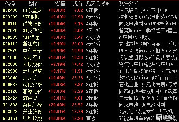 高位股方面,山东墨龙晋级6连板,固态电池概念股诺德股份走出4连板,楚天龙尾盘上演“地天板”录得3天2板。