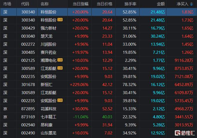 龙虎榜单日净买入额榜前三为科恒股份、强力新材、楚天龙,分别为1.83亿元、1.65亿元、1.64亿元。