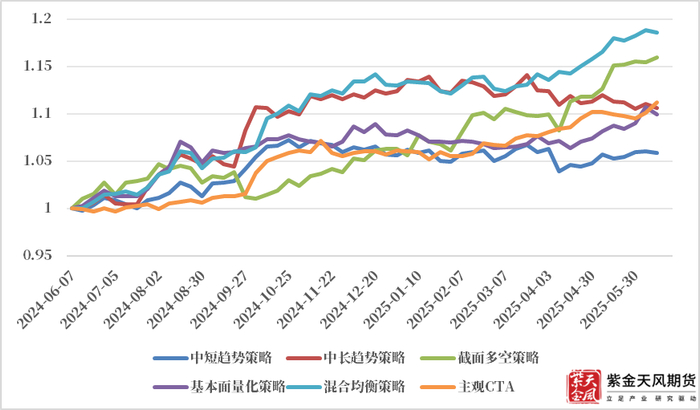 截面多空量化CTA策略今年以来表现较好,收益持续领先其他策略。从市场环境来看,25年以来市场截面强度整体处于偏高水平震荡,且通过各板块走势也可看出板块间强弱关系春节后相对稳定,有色板块整体偏强、而化工及黑色系整体较弱。并且春节后到6月初这段时间内仅4月初各板块出现共振跳空走势,其余时间板块间未出现明显的强弱反转,因此这段时间截面多空策略表现较好,净值持续走高。