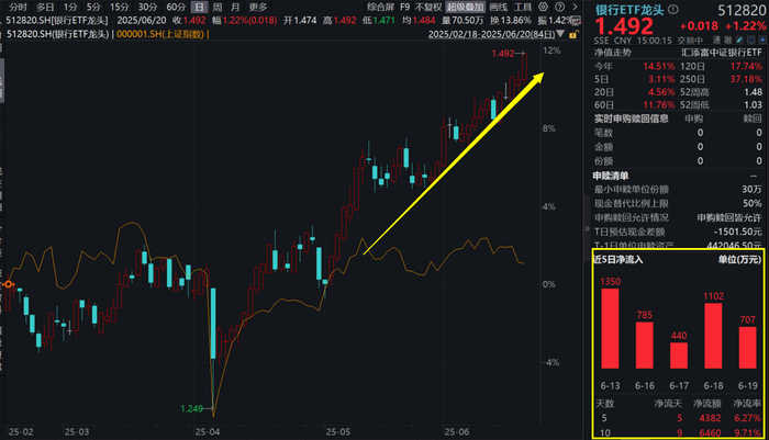 6月20日,银行板块再扛鼎,银行ETF龙头(512820)逆势收涨1.22%,收盘价再创历史新高!