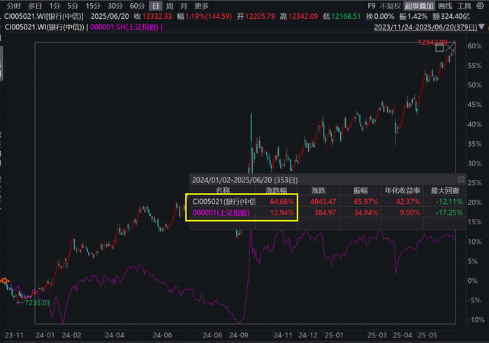 2024年以来,中信一级行业银行板块累计上涨65%,跑赢上证指数51pct,银行指数屡创新高。