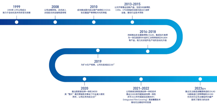 2013年起,小牛根据市场需求成功研发出 CH56(600片/小时)型新一代串焊机。2017年又推出 CHn40 型划片串焊一体机,产能突破3600片/小时,全球市场份额跃居第二。