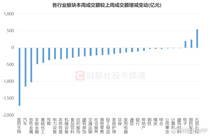 分行业板块看,以本周成交额较上周数据统计,截至今日收盘,医药生物、汽车、有色金属近日降温较为明显,本周成交额较上周下降规模均在1000亿元以上。同时,非银金融、基础化工、传媒、电力设备、农林牧渔等板块也有所降温。而石油石化、国防军工、电子则逆向活跃,为仅有的3个本周成交额较上周增长的板块,在31个申万一级板块中占比近1成。
