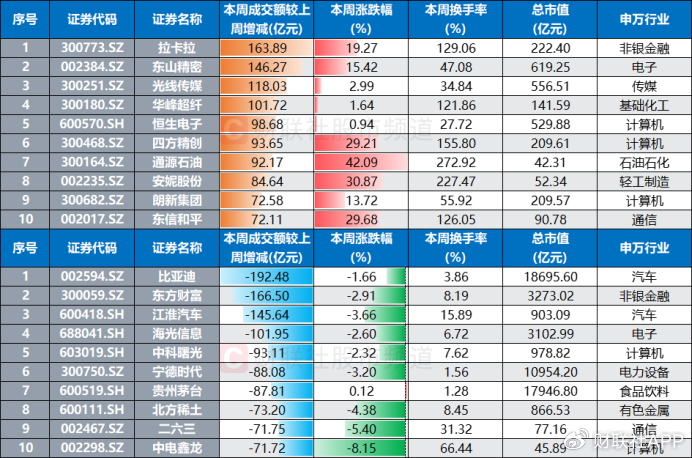 具体个股方面,同样以本周成交额较上周统计,不计算新股情况,累计共有1510余股周内放量,其中,拉卡拉、东山精密、光线传媒、华峰超纤本周成交额较上周均有超100亿元增长,平均每日超20亿元。同时,恒生电子、四方精创、通源石油、安妮股份、朗新集团等股也增长明显。而比亚迪、东方财富、江淮汽车、海光信息、中科曙光等股本周则大幅降温。