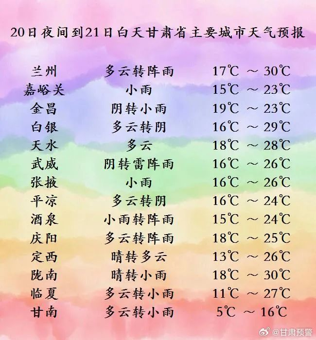 今天夜间到明天白天(06月20日20时-06月21日20时),酒泉、嘉峪关、张掖、金昌等市阴有小雨,局部地方有中雨;武威、甘南、定西、陇南、天水、平凉、庆阳等市州多云转阴,部分地方有小雨;省内其余地方多云,局部地方阴有阵雨或小雨。
