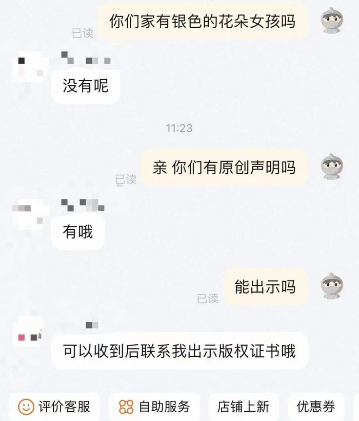 随后,记者在电商平台识图搜索,不少与《梦旅人》高度相似的家居摆件映入眼帘。这些摆件与涉事作品相比,除颜色存在差异外,造型几乎如出一辙。记者联系到销量最高的店铺,客服表示,花朵女孩系列摆件采用环保树脂材质,由自家设计师设计,目前商品上架已有1-2年了,保证原创,并称“可以收到货后联系出示版权证书”。