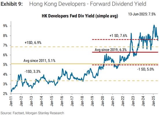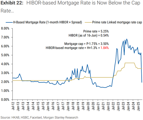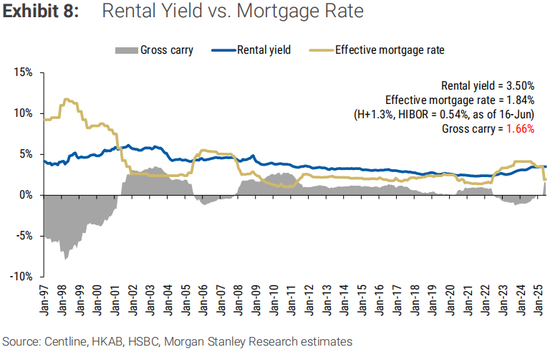 香港房价年初至今表现良好:2025年年初至今,CCL下跌1.5%,低于我们预期的1H25的-5%。这是由于内地买家的贡献增加,以及自2024年2月起全面取消额外印花税。新鸿基位于西沙的大型项目Sierra Sea近期销售强劲,提供9700个单位,加上恒生指数强劲(年初至今上涨21%),提升了市场情绪。近期香港银行同业拆息下跌,导致实际按揭利率下降,有助被压抑的需求和投资需求(由于正套息)。