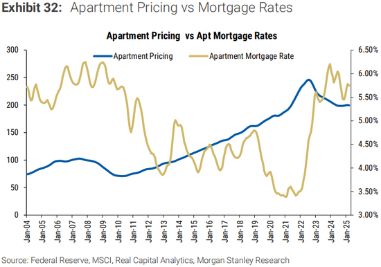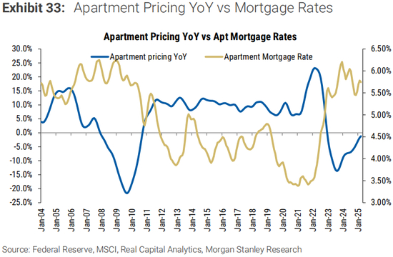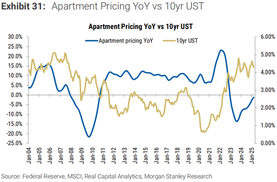 我们的美国REITs和CRE团队也在2023年初引入了房地产价格的量化模型(见CRE Tracker:引入房地产价格的量化模型),并随后对其进行了更新(见CRE月刊:CRE房地产价格触底了吗?重新审视我们的量化模型)。该模型表明,美国的公寓价格可能已经触底,本周期从峰顶到谷底的跌幅为-19.5%。