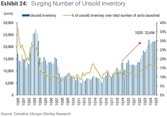 (A)未售库存数量激增:截至25年第一季度末,有22654套未售一手住宅单位(同比增长6%/环比增长1%),连续第七个季度超过2万套。中原地产预计,由于全球贸易紧张局势下的销售下滑以及开发商项目推出速度放缓,第二季度末未售库存将超过2.3万套。按地区划分,黄大仙(包括启德区)的未售出单位最多(5.2K单位),其次是将军澳(2.2K单位)及屯门(1.9K单位)。