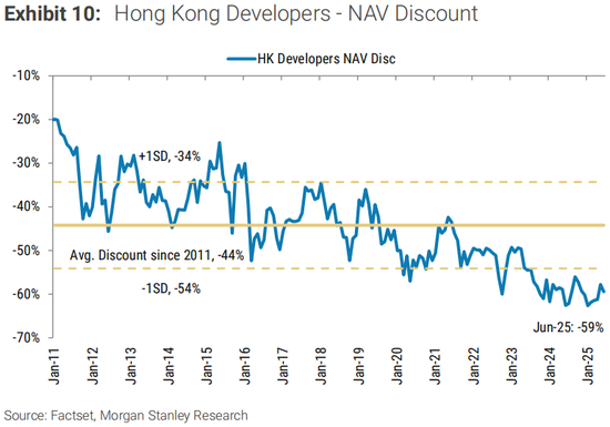 价格是多少?-股票走势往往领先于实际数据点。香港开发商年初至今上涨超过10%,但表现仍逊于上涨21%的恒生指数。上个月,由于香港银行同业拆息下降,开发商的表现有所好转。然而,我们并不认为我们对价格回升的呼吁是一致的,也不是在价格上。如果我们看看2011年至2018年期间,当房地产价格上涨时,资产净值的平均估值折扣在20-40%之间。相比之下,目前相对于资产净值的折让为60%。如果对资产净值的折让缩小到40%,我们可以看到该集团的整体股价上涨50%。因此,我们认为所有的上涨都没有反映在价格中。