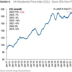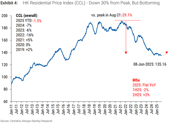 选择底部并不容易,但回报可能很有吸引力。香港房地产价格年初至今下跌2%,过去三个月持平。我们预计25年下半年将增长2%。