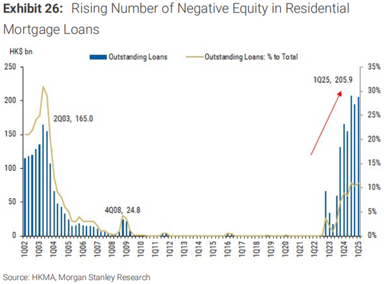 (B)负资产个案数目上升:根据香港金融管理局的资料,负资产住宅按揭贷款宗数由二四年第四季的38,389宗,上升6%至二五年第一季的40,741宗,占住宅按揭贷款总额的6.9%,是自二四年第三季以来的最高水平。这些个案均与按揭保险计划下的住宅按揭贷款或银行职员按揭贷款有关,而这些贷款的按揭成数一般较高。3月底,负资产住宅按揭贷款总值增加至2059亿港元(占未偿还总额的11%)。最近一家本地大银行的裁员可能会进一步推高这一数字,因为银行员工通常可以以更优惠的利率从雇主那里获得更高的按揭贷款。
