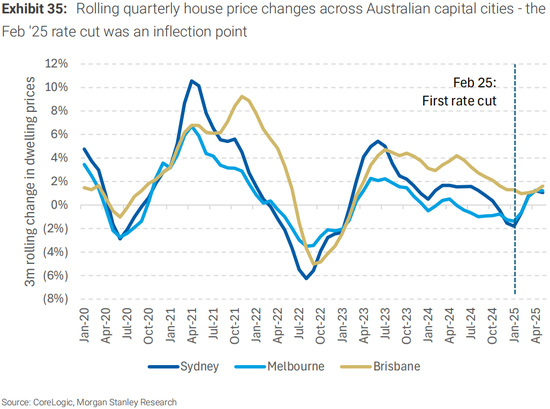 澳大利亚正处于多次降息周期的中期,我们的澳大利亚宏观团队预计将在2025年8月和11月进一步降息(各25个基点),并在2026年进一步降息,将利率降至3.10%的最终水平,而2023/2024年的峰值为4.85%。到目前为止,最近的削减刺激了住房活动,悉尼/墨尔本住宅价格年初至今上涨+1.5%/+1.4%,而2024年的年度总变化为+2.3%/-3.0%。