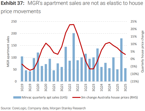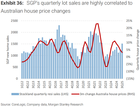 我们的宏观观点是,澳大利亚当前的住房周期更有可能是由交易量活动(一级和二级市场)的上升所驱动,而不是简单地由于可负担性限制而导致的房价,这意味着2025年的整体房价增长可能是温和的(个位数)。因此,我们保留对Stockland(SGP.ASX)的偏好,而不是Mirvac(MGR.ASX),因为SGP倾向于更多负担得起的土地和更高的首次购房者风险敞口,我们认为这更有利于降低利率。我们对以往房地产周期的分析表明,土地销售对房价变化的弹性要大得多,而公寓销售则受到各种因素的影响,包括投资者活动、海外兴趣和推出周期。