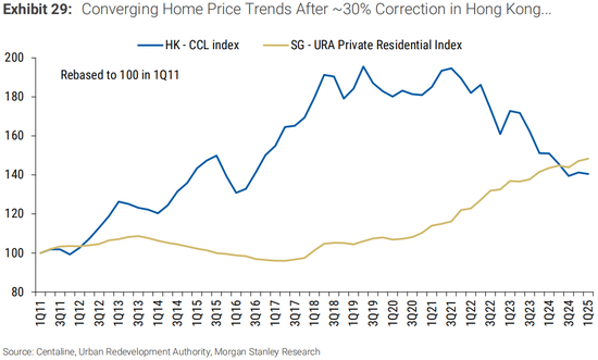 得益于美国量化宽松政策后的超低利率环境和内地买家的投资需求,香港住宅市场自2011年以来一直处于明显的上升趋势。从2012年开始,香港的房价一直超过新加坡,直到2018年。自那以来,新加坡房价上涨了50%,而香港房价则下降了30%。如下图所示,自2011年以来,香港价格在指数基础上低于新加坡。