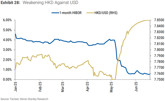 但港元兑美元走弱:本周港元接近港元兑美元联系汇率的下限7.85,两种货币的潜在套利交易可能使香港银行同业拆息回到正常水平。