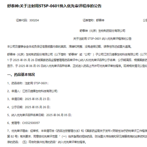 近日,创新药牛股舒泰神(300204.SZ)接连发布公告,创新药“注射用STSP-0601”收到了国家药品监督管理局下发的关于境内生产药品注册上市许可申请的《受理通知书》,同时该产品被国家药品监督管理局药品审评中心纳入拟优先审评品种公示名单。