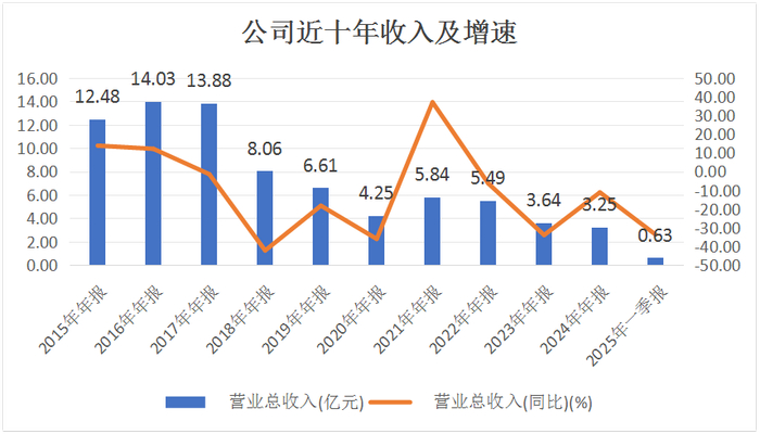 公司近十年收入、归属于母公司股东的净利润呈现明显的下滑态势,其中收入从2015年的12.48亿元下降到2024年的3.25亿元,累计下滑74%;归属于母公司股东的净利润从2015年的2.11亿元下降到2024年的-1.45亿元,2020年到2025年的归属于母公司股东的净利润更是连续五年亏损,分别为-1.33亿元、-1.37亿元、-1.97亿元、-3.99亿元、-1.45亿元,经营压力巨大。