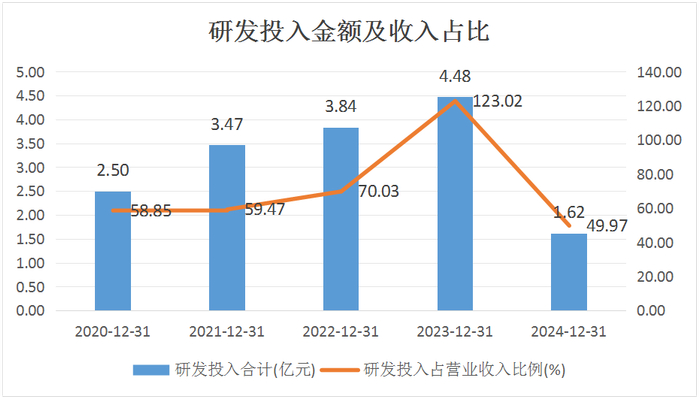 舒泰神2020年到2023年研发费用维持在高位,这也是影响利润的重要因素,从金额上来说,2020年到2023年研发投入分别为2.5亿元、3.47亿元、3.84亿元、4.48亿元,占营业收入的比例分别为58.85%、59.47%、70.03%、123.02%,然而,2024年研发投入骤降至仅1.62亿元,占营业收入的比例也降低到49.97%;