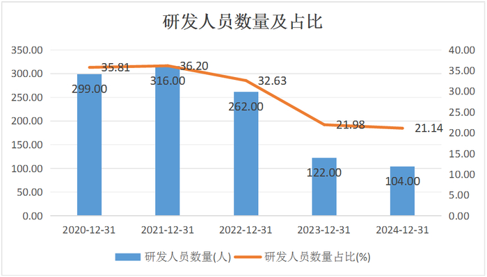同时,研发人员数量也从2020年的299人降至2024年的104人,研发人员在公司总人数中的占比也从2020年的35.81%降至2024年的21.14%;研发支出资本化金额呈现明显的上升态势,从2020年的0.07亿元上升至2024年的0.55亿元,资本化研发支出占研发投入的比例同样大幅度提升,从2020年的2.62%提升到2024年的34%;