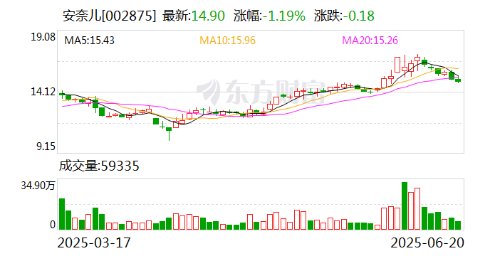 证券时报·数据宝统计显示,安奈儿今日收盘价为14.90元,下跌1.19%,日换手率为3.25%,成交额为8919.19万元,全天主力资金净流出477.85万元,近5日该股累计下跌8.48%,近5日资金合计净流出2379.18万元。(数据宝)