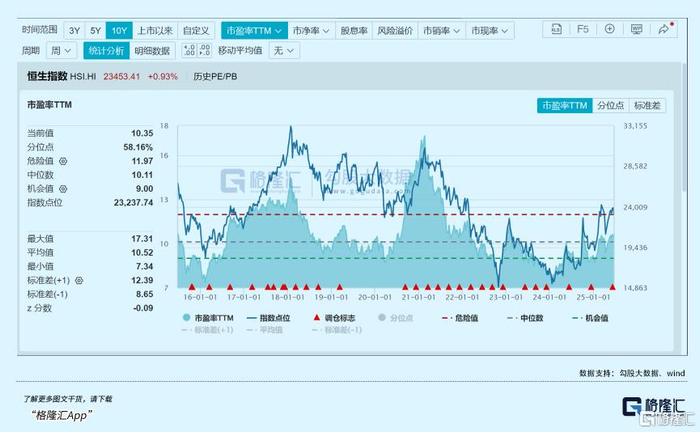 首先是整体维度,恒生指数最新的市盈率(TTM)为10.35倍,位于过去10年58.16%的分位点,大概是在均值或者说中位数的位置,不算高,当然也需要承认,没有像2022年10月底那样低。