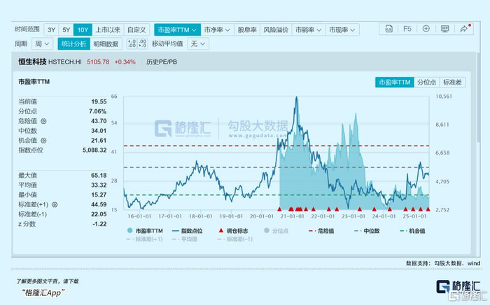 科技股集中营--恒生科技指数,市盈率(TTM)为19.55倍,位于指数2020年7月27日发布以来7.06%的分位点,属于历史性的低位区间。