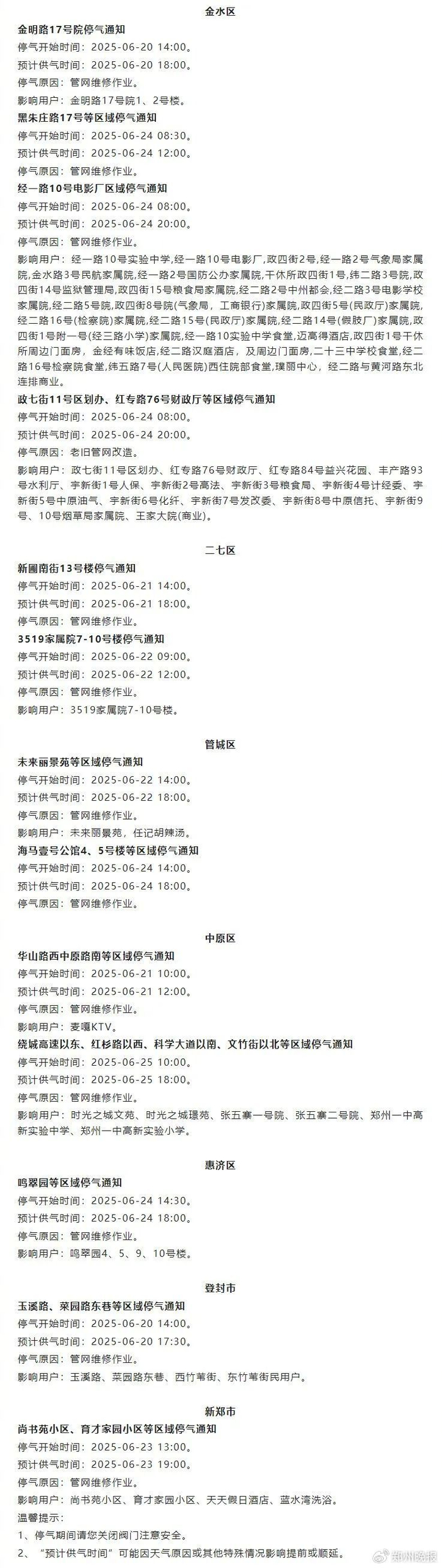 6月20日,记者从郑州华润燃气了解到郑州多区域因管网维修作业、老日管网改造等原因将停气作业,请大家提前做好准备,注意安全。