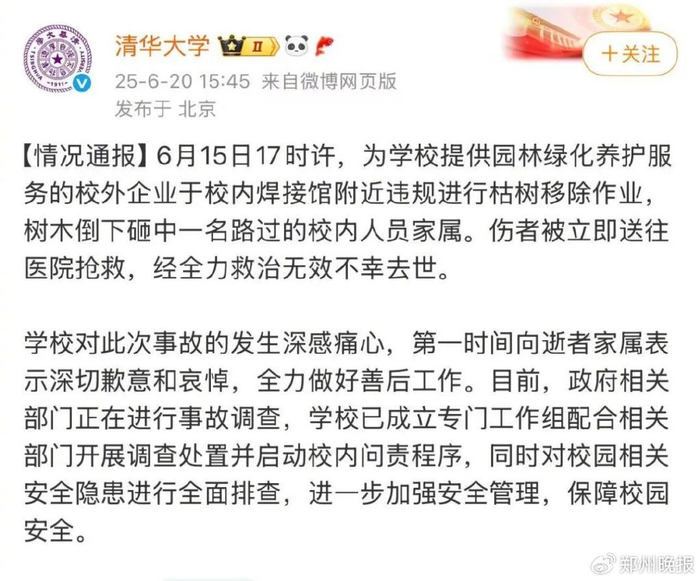 北京语言大学商学院国际经济与贸易系主任张爱玲教授近日逝世,目击者称其在清华大学内骑车时被树砸中。6月20日,清华大学回应:校外企业违规进行枯树移除,相关部门正在调查,已启动问责程序。