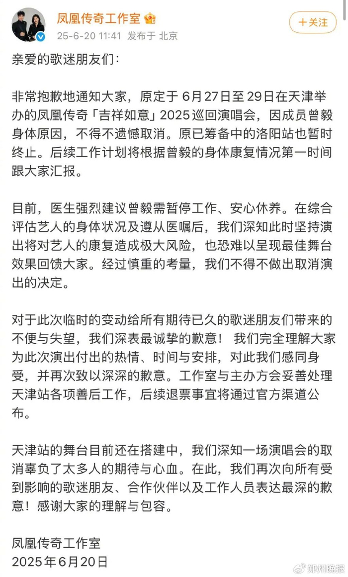 6月20日,@凤凰传奇工作室发文表示:原定于6月27日至29日在天津举办的凤凰传奇2025巡回演唱会,因成员曾毅身体原因,不得不遗憾取消。原已筹备中的洛阳站也暂时终止。