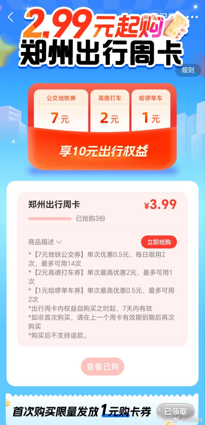 即日起至8月31日,郑州推出支付宝出行优惠活动:2.99元可购原价3.99元的郑州出行周卡(含10元权益,涵盖公交地铁、高德打车、哈啰单车优惠),还可在地铁站绿城通自助充值机用支付宝充值,至高立减5元,90天未用支付宝充值者可立减2元。