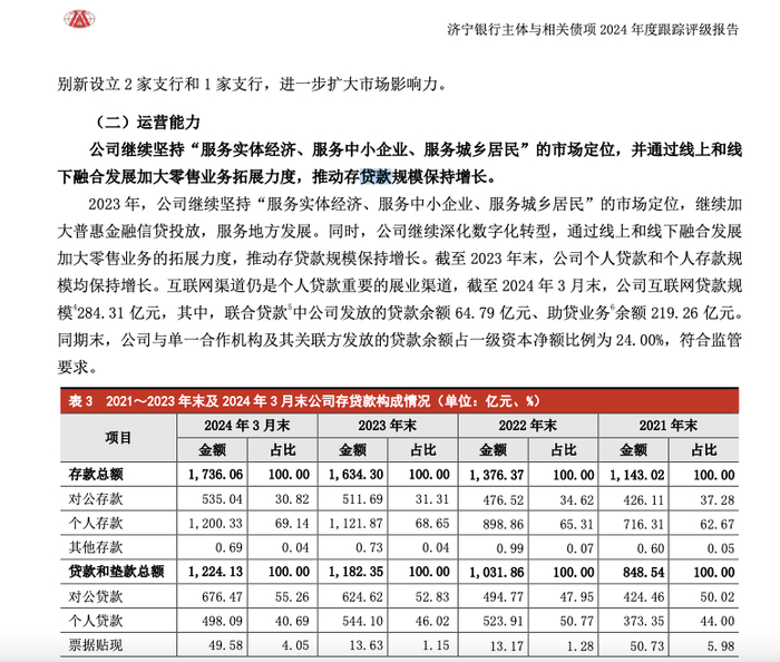 此外,前述《报告》中披露一些细节。《报告》指出,互联网渠道是济宁银行个人贷款重要的展业渠道,截至2024年3月末,公司互联网贷款规模284.31亿元。其中,联合贷款中公司发放的贷款余额64.79亿元、助贷业务余额219.26亿元。而同期末,个人贷款总额为498.09亿元。