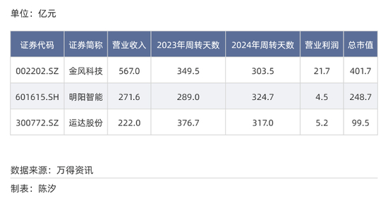 2024年,风电整机行业上市公司的“应付账款及票据周转天数”中值为324天,金风科技为303天,明阳智能为324天,运达股份为317天。我们发现,该行业头部公司的“周转天数”数值比较相近。