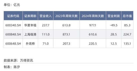 2024年,产业地产行业上市公司的周转天数中值为427天。华夏幸福由于债务压力,其周转天数高达977天,上海临港为610天,外高桥为221天。产业地产头部公司之间的差距较大。