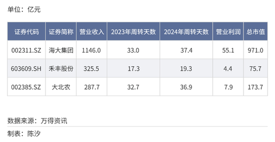 2024年,海大集团的“应付账款及票据周转天数”为37.4天,禾丰股份为19.3天,大北农为36.9天,行业中值为33.1天。