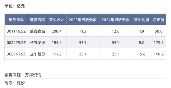 2024年,益客食品“应付账款及票据周转天数”为12.6天,圣农发展为55.1天,立华股份为23.1天,行业中值为31.6天。
