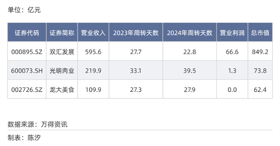 2024年,双汇发展的“应付账款及票据周转天数”为22.8天,光明肉业为39.5天,龙大美食为27.9天,行业中值为27.9天。