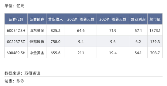 2024年,山东黄金的“应付账款及票据周转天数”为71.9天,恒邦股份为9.6天,中金黄金为19.4天,行业中值为43.8天。黄金公司的周转天数差距很大,这主要源于外购黄金矿石的比例不同。恒邦股份主要依赖外购金矿石,所以周转天数非常低。