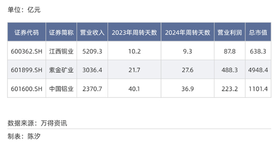 2024年,江西铜业的“应付账款及票据周转天数”为9.3天,紫金矿业为27.6天,中国铝业为36.9天,行业中值为34.3天。
