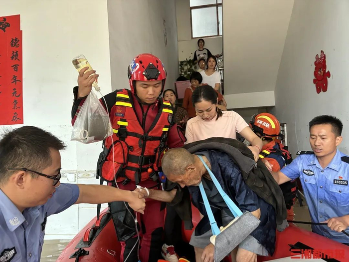 12时53分,两个救援小组赶赴龙山县印刷厂转移被困群众。紧急救援中,一名消防员小心翼翼地托起老人的输液瓶,在积水中护其转移,为生命擎起希望。