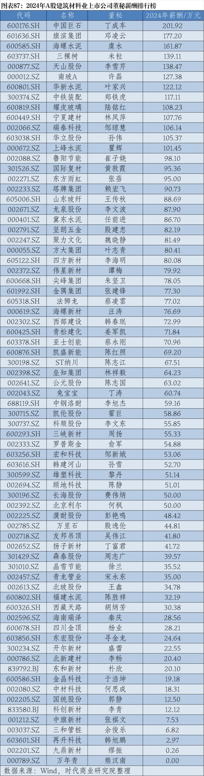 2024年,A股建筑材料业董秘的薪酬平均值为66.81万元。其中,薪酬最高的是中国巨石(600176.SH)丁成车,为201.92万元;薪酬最低的是九鼎新材(002201.SZ)缪振,为0.26万元。