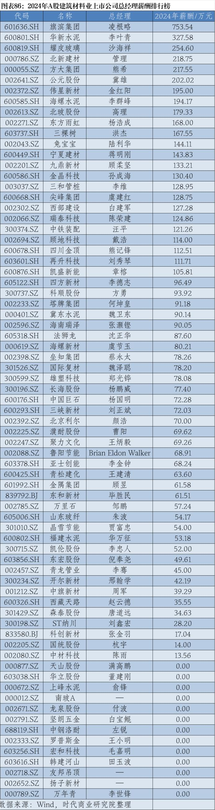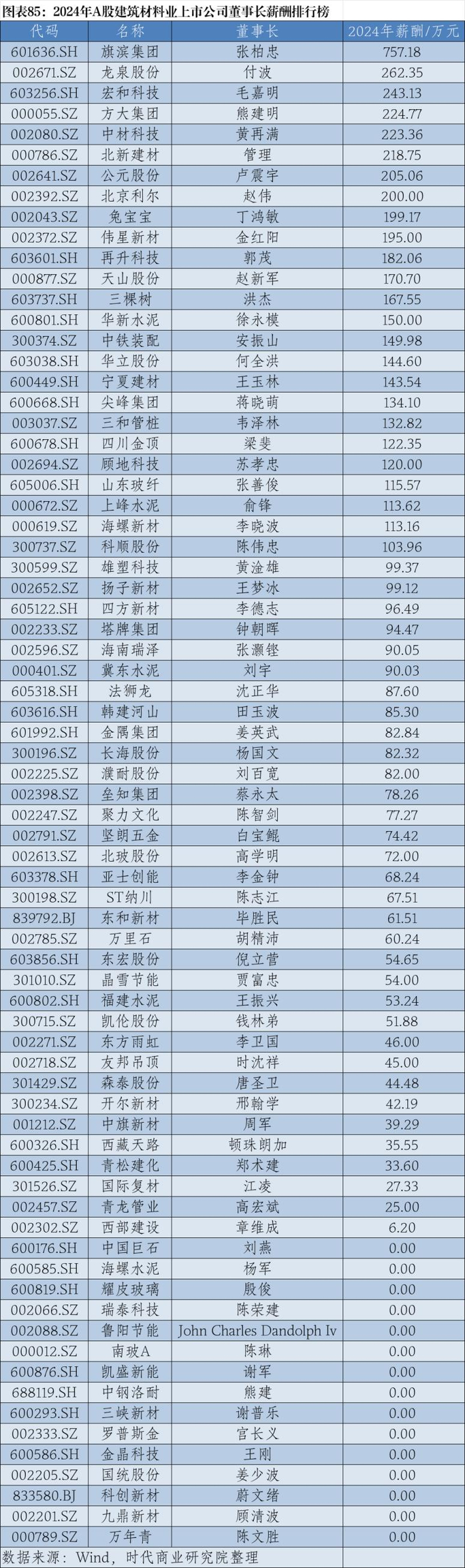 建筑材料:旗滨集团董事长张柏忠薪酬居首