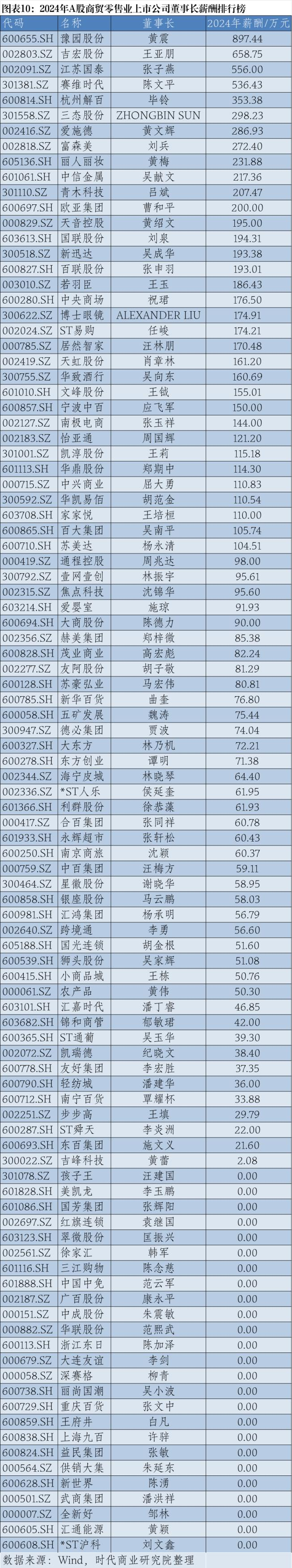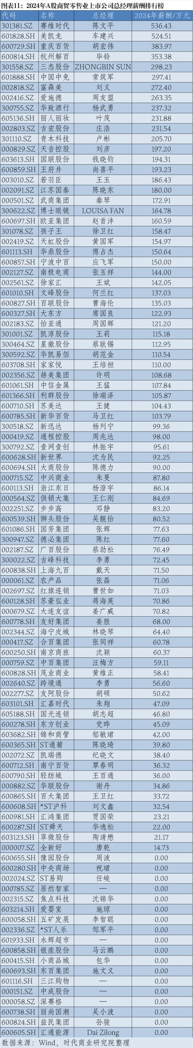 2024年,A股商贸零售业总经理的薪酬平均值为126.30万元。其中,薪酬最高的是赛维时代(301381.SZ)陈文平,为536.43万元;薪酬最低的是全新好(000007.SZ)唐乾,为14.73万元。