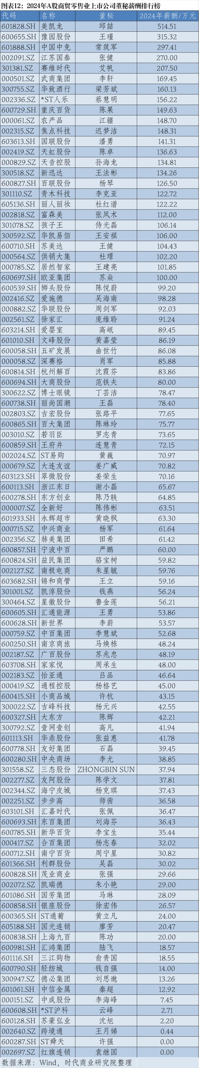 2024年,A股商贸零售业董秘的薪酬平均值为80.26万元。其中,薪酬最高的是美凯龙(601828.SH)邱喆,为514.51万元;薪酬最低的是跨境通(002640.SZ)王月娣,为0.44万元。