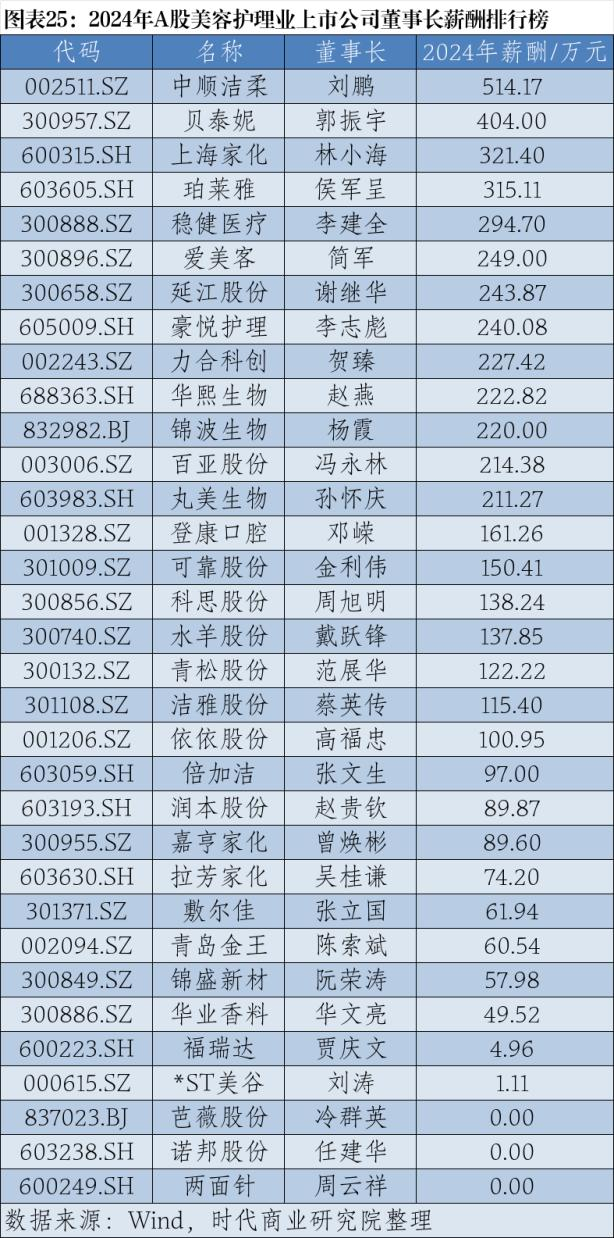 美容护理:中顺洁柔董事长刘鹏薪酬最高
