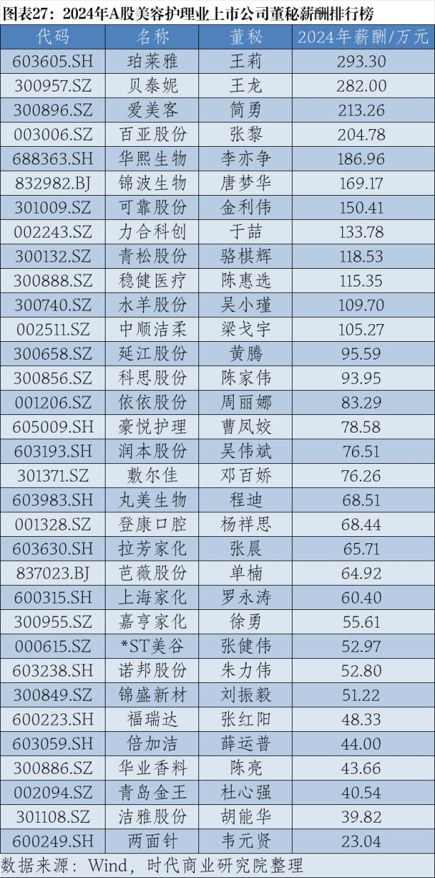 2024年,A股美容护理业董秘的薪酬平均值为102.02万元。其中,薪酬最高的是珀莱雅(603605.SH)王莉,为293.30万元;薪酬最低的是两面针韦元贤,为23.04万元。