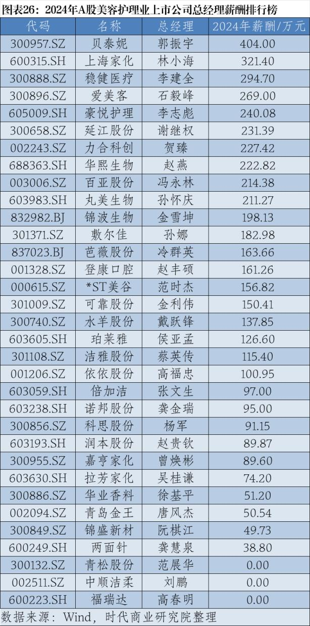 2024年,A股美容护理业总经理的薪酬平均值为161.92万元。其中,薪酬最高的是贝泰妮(300957.SZ)郭振宇,为404.00万元;薪酬最低的是两面针(600249.SH)龚慧泉,为38.80万元。