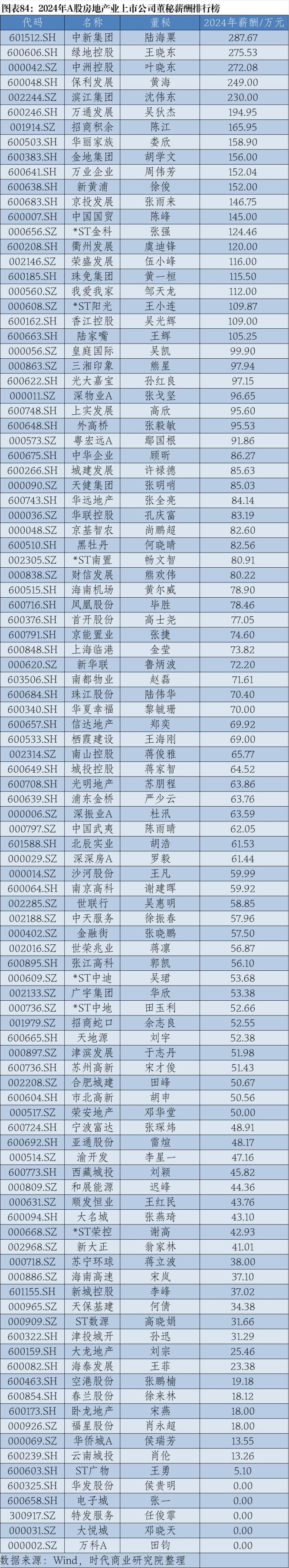 2024年,A股房地产业董秘的薪酬平均值为81.76万元。其中,薪酬最高的是中新集团陆海粟,为287.67万元;薪酬最低的是邵宇平(600603.SH)王勇,为5.10万元。